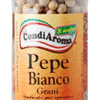 Il pepe bianco è ottentuo dalle bacche più grosse della pianta del pepe, vengono messe a macerare in acqua per separare l’involucro esterno. I semi chiari essiccati vengono venduti a prezzi superiori rispetto a quello nero. Il pepe bianco ha sapore meno forte e meno piccante di quello nero e si sposa meglio ai sapori agrodolci,maionesi e insalate ai fondi di cottura chiari, ai gusti più delicati come soufflé.